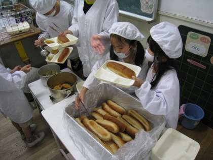 1年生の給食は、教職員や6年生のお手伝いの人が配膳していましたが、今週あたりから1年生の給食当番が、給食を配膳し始めました。汁物を入れた1年生に感想を聞くと、「大変だったけど、おかずを入れるのが楽しかった。」と答えてくれました。