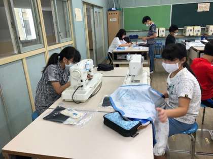 密を防ぐ意味もありますが、少ない人数なので、ミシンの台数も十分にあり、次々と作業が進み、出来上がった人もいました。修学旅行の時、手作り体験ができることになれば、持って行く予定です。