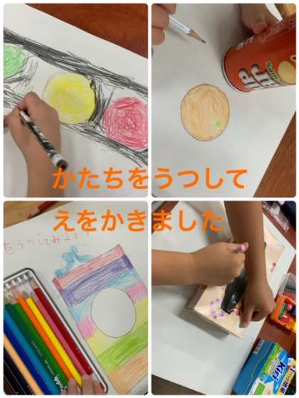1年生の算数科では『いろいろなかたち』を学習しています。今回の学習では子どもたちが家から持ってきた箱や筒をつかって、かたちをうつして絵を描きました。いろいろなかたちを組み合わせて、絵を描き、とても楽しみながら学習することができました。