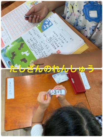 1年生の算数科の学習では『たしざん』の学習に取り組んでいます。ブロックなどの具体物を使いながら考えたり、問題文を読んで式を考えたり、たくさんの学習に取り組みました。今日は文章題から式を考え、答えを導き出す学習を行い、その後、計算カードを使って、答えを考える練習をしました。どの児童もやる気をもって取り組むことができました。