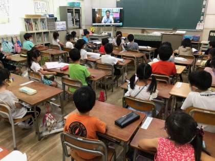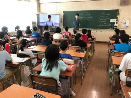 密集を防ぐため、1学期は朝会・集会をオンラインで行っていましたが、他校も同じ時間帯に実施するために回線が混雑し、うまくつながらないことがあるため、事前に映像を撮影しておき、各教室で時間を合わせてビデオを流しました。