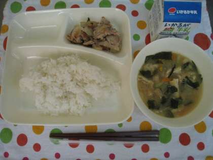 25日から給食が始まりました。この日の献立は、ぶた肉のしょうが焼き、みそ汁、ごはん、牛乳でした。