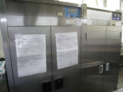 児童数が年々増加し、調理器具や食缶が増えてきたので、夏休みの間に、給食室に新しく消毒保管庫が増設(右側の保管庫)されました。