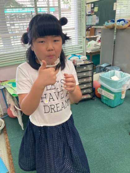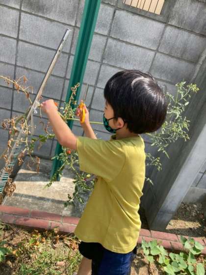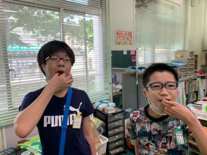 なかよしの畑で赤く立派に育ったミニトマトを収穫しました。なかよしで学習していた子どもたちで試食をしました。口に入れると「おいしい!」と声があふれて、とっても甘くて美味しく、大満足でした。