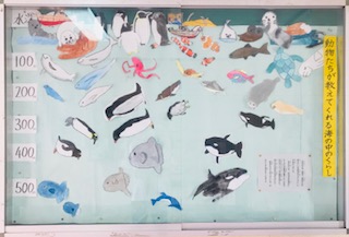 水深何メートルで暮らしているのか、どんな動物たちが同じ水深にいるのかがわかりやすく表されています。こうして目に見えるようにグラフや表などで表すとわかりやすいことも学習しました。
