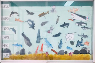 今三国小学校の玄関には、5年生が国語科教材『動物たちが教えてくれる海の中のくらし』で学習したことをもとに、海の中の動物たちの絵が掲示されています。