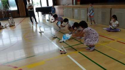 生活科で「うごくおもちゃをつくろう」の第一弾としてヨットカーを作り、その仕上げとして講堂で走らせる活動をしました。