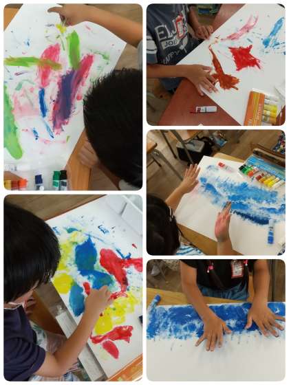 筆ではなく指で直接絵の具を広げていくことに最初は抵抗があったようですが、慣れてくると「楽しいー!」と夢中になりました。