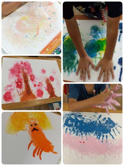 絵の具を直接、指や手につけたり、画用紙に広げたりして、絵を描いていきます。