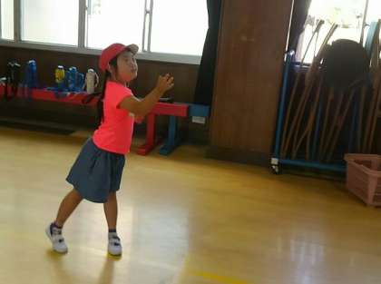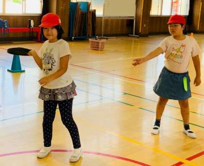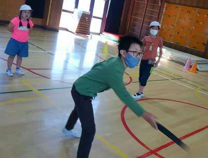 始めにラジオ体操でしっかり準備体操をしました。先生に投げ方を教えてもらったあと、2〜3人のグループで投げる練習をしました。始めは、なかなか思うようにできず、違った方向に飛んでしまうことがありましたが、練習を重ねるごとに狙ったところに上手に投げられるようになってきました。友だち同士で投げ方を教え合う姿も見られました。