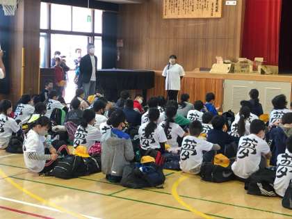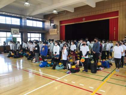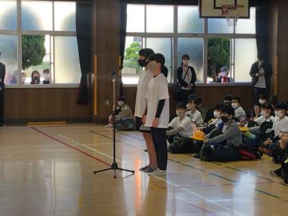 校長先生からは、「決められたことはきちんと守り、感染対策を万全にして楽しんでほしい」「気持ちが緩んでしまってケガにつながらないよう気をつけて欲しい」との話がありました。児童代表からは「楽しみにしていること」「感染に気をつけて過ごすこと」を話しました。