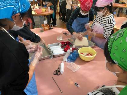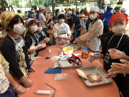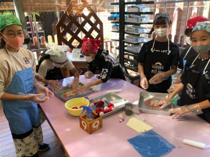 お肉を練ったら、ヘラでお肉を真ん中に寄せ、バジルを入れたいグループは入れます(グループで入れるかどうか決めています)。バジルをいれたグループはさらに混ぜ、入れないグループはお肉を薄くのばしておきます。