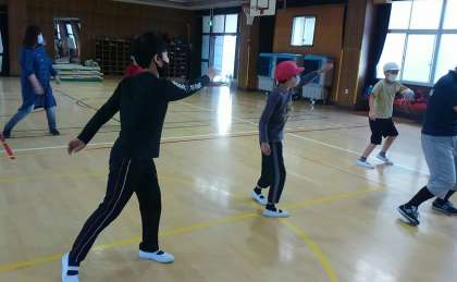 肩や腕、足など全身をしっかりストレッチをしたあと、ダンスにチャレンジ!かっこいいい音楽に合わせて足を交互に動かして進んだり、両足をリズミカルに左右に動かしながら腕を振ったりと、色々なステップに挑戦しました。少し難しそうにしている時もありましたが、みんなとても楽しんでいい汗をかいていました。