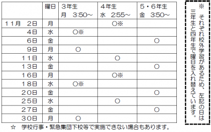 先日「放課後ステップアップ教室」申込者に11月の予定表を配付しました。校外学習などによる変更がありますのでご確認ください。