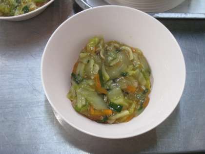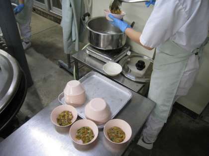 うずら卵の個別対応給食の日でした。卵アレルギーの児童分は、うずら卵を入れる前に取り分けます。個別対応食は見分けやすいようにピンクのお椀に入れています。今回は、中華丼の具材が個別対応食でした。