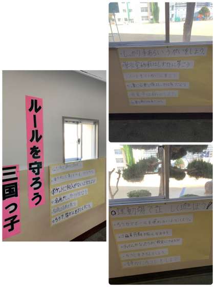 運営委員会で、三国小学校の生活のきまりについて話し合いました。全校みんなが守ることができていること、もう少しみんなでがんばった方がよいことを出し合いました。みんなでルールを守ることが、楽しい学校生活につながると思い、職員室前に「ルールを守ろう三国っ子」を掲示しました。毎日みんなが通る廊下なので、一人ひとりが意識していけるようにしたいと思います。