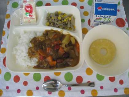 この日の給食は、牛肉と金時豆のカレーライス、ごぼうサラダ、パインアップル(缶)、牛乳でした。