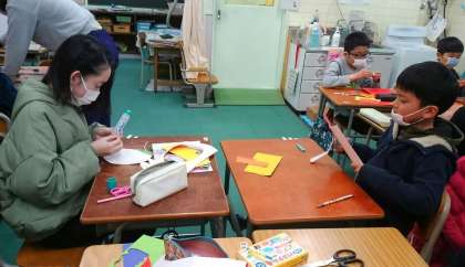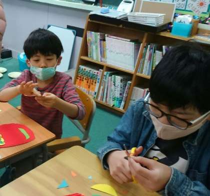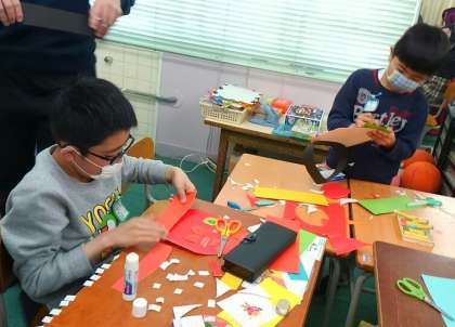 始めに赤の段ボール紙を切って、自分の好きな顔の形を作りました。次に、カラーシートに顔のパーツを書いて切り取り、自由に組み合わせて顔に貼っていきました。自分たちで工夫してイナズマの眉毛を作ったり、目を3つつけたりとオリジナルのお面を作ることができました。どんな顔の形になるかワクワクしながら、みんな集中して楽しんで取り組んでいました。かわいい顔や迫力のある、おにのお面ができました。