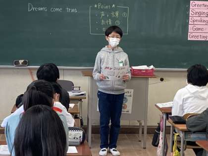 今日は、先週の学習の続きで「なりたい職業を発表しよう」でした。それぞれが職業カードを描いて、みんなの前で発表しました。「Hi!」から始まって、自分のなりたい職業とその理由を説明しました。同じ職業でも、理由が様々でとても面白かったです。聞いている友だちは「Nice!」「Great!」などと声をかけていました。楽しい雰囲気で盛り上がりました。
