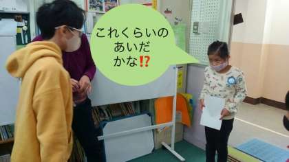 その後、向かい合って挨拶する場面を想定し、それぞれのちょうどいいあいだはどれくらいか一人ひとり体験して印をつけていきました。特性ビニールシートの上にそれぞれの結果を合わせてビックリ!改めてみんなの思うちょうどいいあいだは近すぎることが分かりました。印をみてそれぞれちょうどいいと思う「あいだ」は違うことや場面や場所、気分によって違うけれど、誰もが心地よいあいだは、「腕一本分のあいだ」をとることを学習しました。