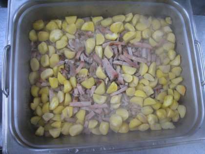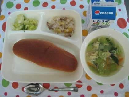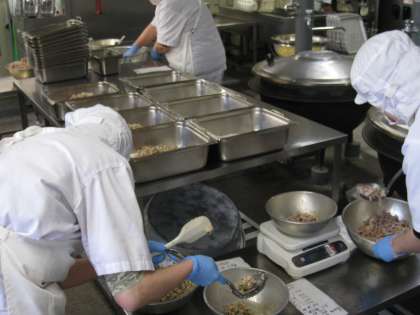 中華おこわは、ミニバットに一クラス分ずつもち米、調味液、焼き豚、くり、しいたけを入れて混ぜ、焼き物機で蒸し焼きにしてつくります。