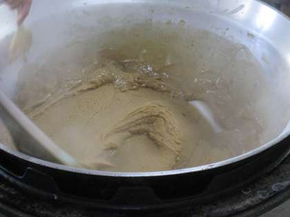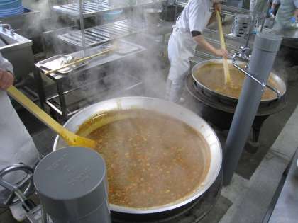 ハヤシライスのルウは、給食室で小麦粉と油から作る手作りルウです。褐色になるまでいため、香ばしいいい香りがしてくると出来上がりです。