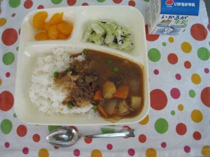 この日の給食は、ハヤシライス、キャベツのひじきドレッシング、みかん(缶)、牛乳でした。
