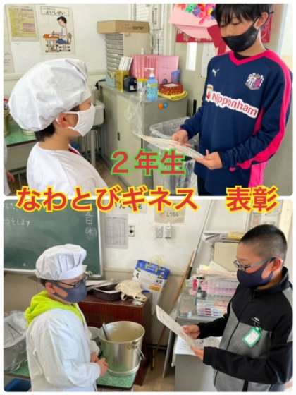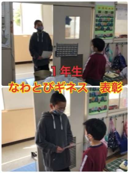1年生・2年生のなわとびギネスの表彰を行いました。1・2年生は『前とび』『後ろとび』『あやとび』の3つの種目のチャレンジ記録に挑戦しました。なわとびチャレンジの期間中はたくさんの子どもたちが、自分のベスト記録を更新することができました。本当によく頑張りました!!