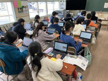 教室に届いた一人一台のタブレット型パソコンを使用し、社会科などの調べ学習で使用したり、算数科や理科のプログラミング学習で使用したりしています。