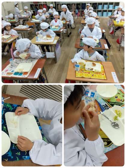 初めてパンの献立給食でしたが、みんなもりもり食べて完食しました。