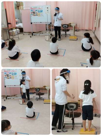 保健室の先生のお話をしっかり聞いてから、身長と体重を測りました。