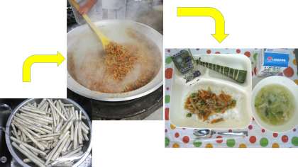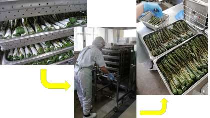 大阪市の学校給食のちまきは、原材料はすべて国産で、一般的に市販されているものより糖分をひかえたものです。米の粉などで作ったもちを、熟練の職人が1本ずつ手で巻いて仕上げています。学校には、冷凍の状態で届き、給食室で焼き物機で蒸しています。