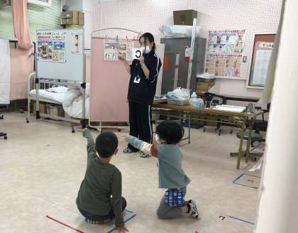 開いている方を指さして伝える方法を養護教諭の先生に教わり、一人ずつ静かに検査することができました。保健室のルール「入退室前後には手洗い・消毒をする」も、しっかりと行うことができています。