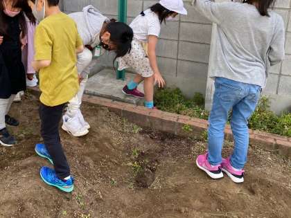 学習園の雑草を抜き、肥料を入れてかき混ぜた土を入れて、ミニトマトの苗を植えました。
