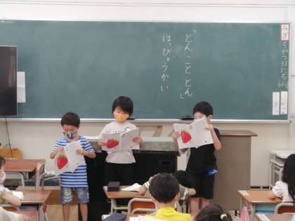 「とん こと とん」の音読発表会をしました。グループで役を決めて、練習を行いました。