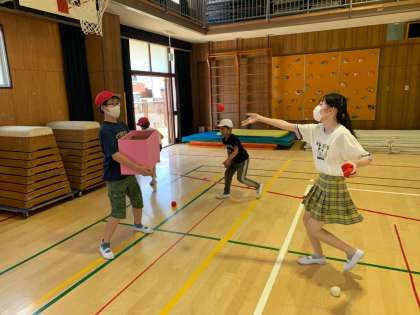 その後、それぞれのチームごとに分かれて、色付きのダンボールの中に玉を入れる練習をしました。練習が一通り終わった後、赤白に分かれて、カゴを持つ順番を決めました。決める時は高学年が率先して話し合いを行っていました。