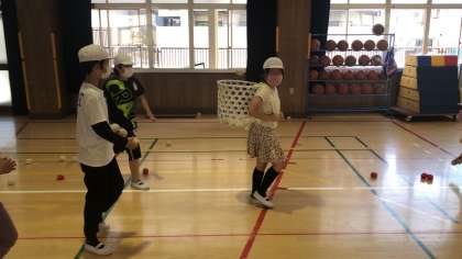 「チームできょうりょくしていどうたまいれをたのしもう!」というめあてで、移動玉入れを講堂でしました。まずはじめに、移動玉入れをする時の約束(カゴをもつ人は、線の上をあるくこと・玉をもつ人は、下からなげること)を聞きました。