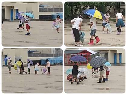 そこで、雨がぱらつく校庭で少しの時間、雨の日も遊べるよという学習をすることに。