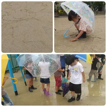 水溜りでパシャパシャしたり、地面に絵を描いたり、泥を触ったり。