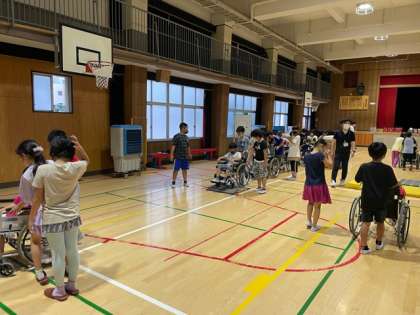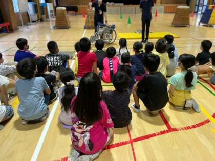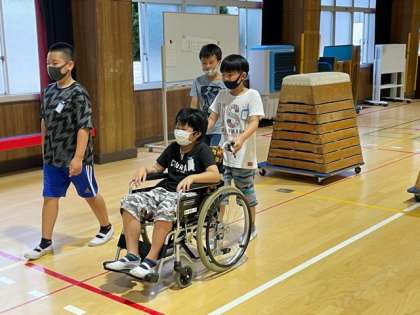 車いす体験がありました。まず友だちを車いすに乗せ、車いすを押す体験をしました。その後、車いすの自走体験をしました。子どもたちからは、「今回の体験で、乗る側の気持ちと押す側の気持ち、両方がわかりました」と、車いすを利用する人たちへの理解を深めていました。