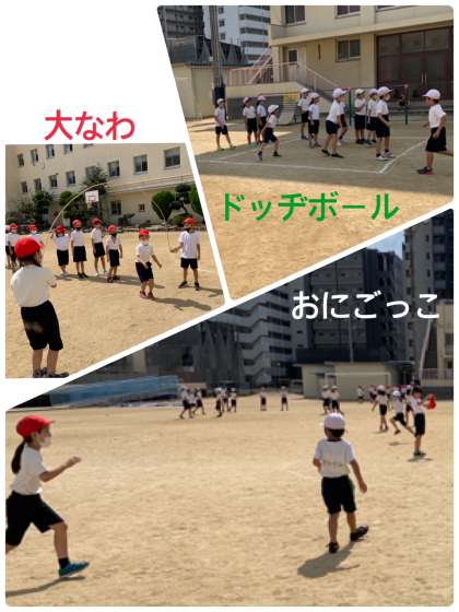 運動場の体育では、大なわ、ドッヂボール、おにごっこの3つを時間交替でやっています。
