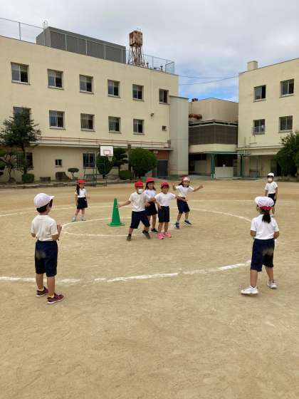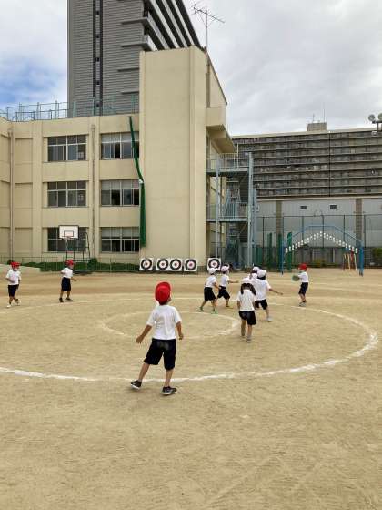 1年生運動場の体育では、ボール投げゲームをしています。今日は5対5に分かれて、中心に置かれたコーンを狙ってボールを投げるゲームをしました。攻める方はパスを上手に使ったり、少し場所を変えて投げてみたり、工夫してコーンを狙っていました。