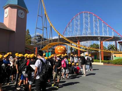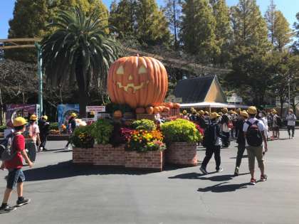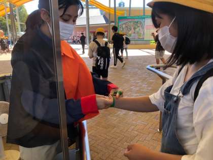フリーパスを腕に巻いてもらい、ハロウィンムードの園内へ!グループごとに楽しみます。