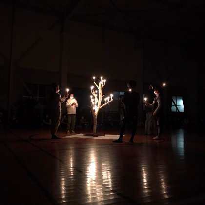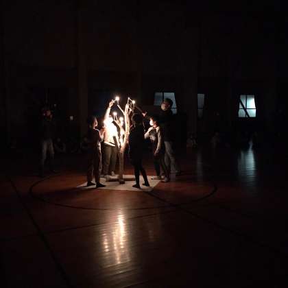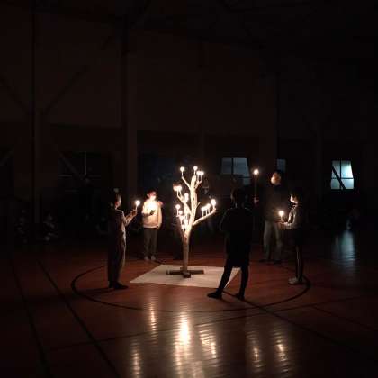 天気を考慮し、キャンプファイヤーを変更して、体育館でキャンドルサービスをおこなっています。