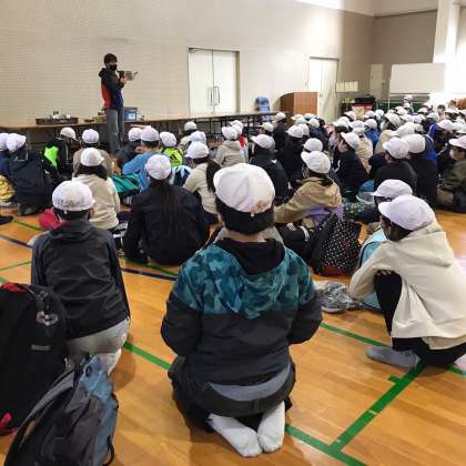 おいしいカレーを作るために、みんな真剣に宿舎の方の話を聞いています。