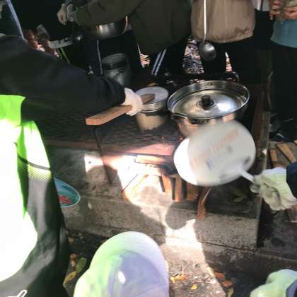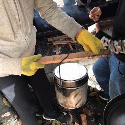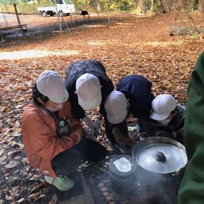 火起こしで使う薪の量の加減や、料理手順など、学校ではなかなか学習できないことに戸惑いながらも、班のメンバーと相談しながらおこなっています。