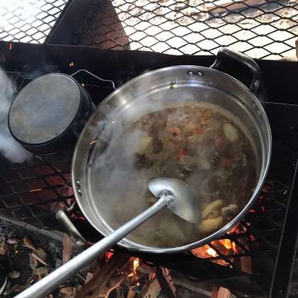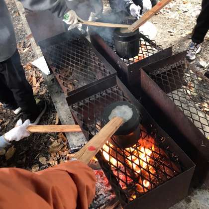 薪で飯ごうに触れて、炊けているかどうか確かめています。