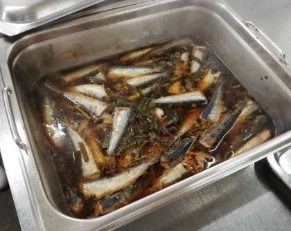 いわしのしょうが煮は、クラスの人数分のいわしと調味料をミニバットに入れ、焼き物機で30分間煮てつくります。骨までやわらかく仕上がっていました。魚が苦手な子も、1尾はがんばって食べている子が多かったです。少しずつ魚のおかずにも慣れてくれたら、と思います。