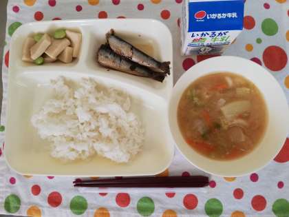 この日の給食は、いわしのしょうが煮、みそ汁、高野どうふの煮もの、ごはん、牛乳でした。
