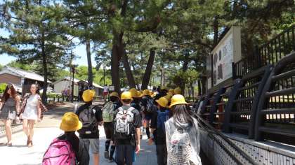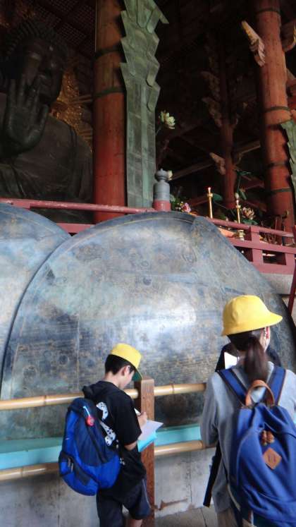 5月21日木曜日、奈良公園へ行きました。近鉄奈良駅の前にある銅像を指さし、「勉強した行基だ」と声をあげる子ども。大仏を見上げながら、その大きさに驚きを見せる子ども。二月堂から奈良の町を見下ろしながら、「きれい」と感動する子ども。今回の校外活動を通して子どもたちは、教室から飛び出し、実物に触れることの大切さに気づくことができました。東大寺大仏殿、正倉院、二月堂、春日大社をまわったオリエンテーリングでは、グループの絆、学年の絆を深めることができました。